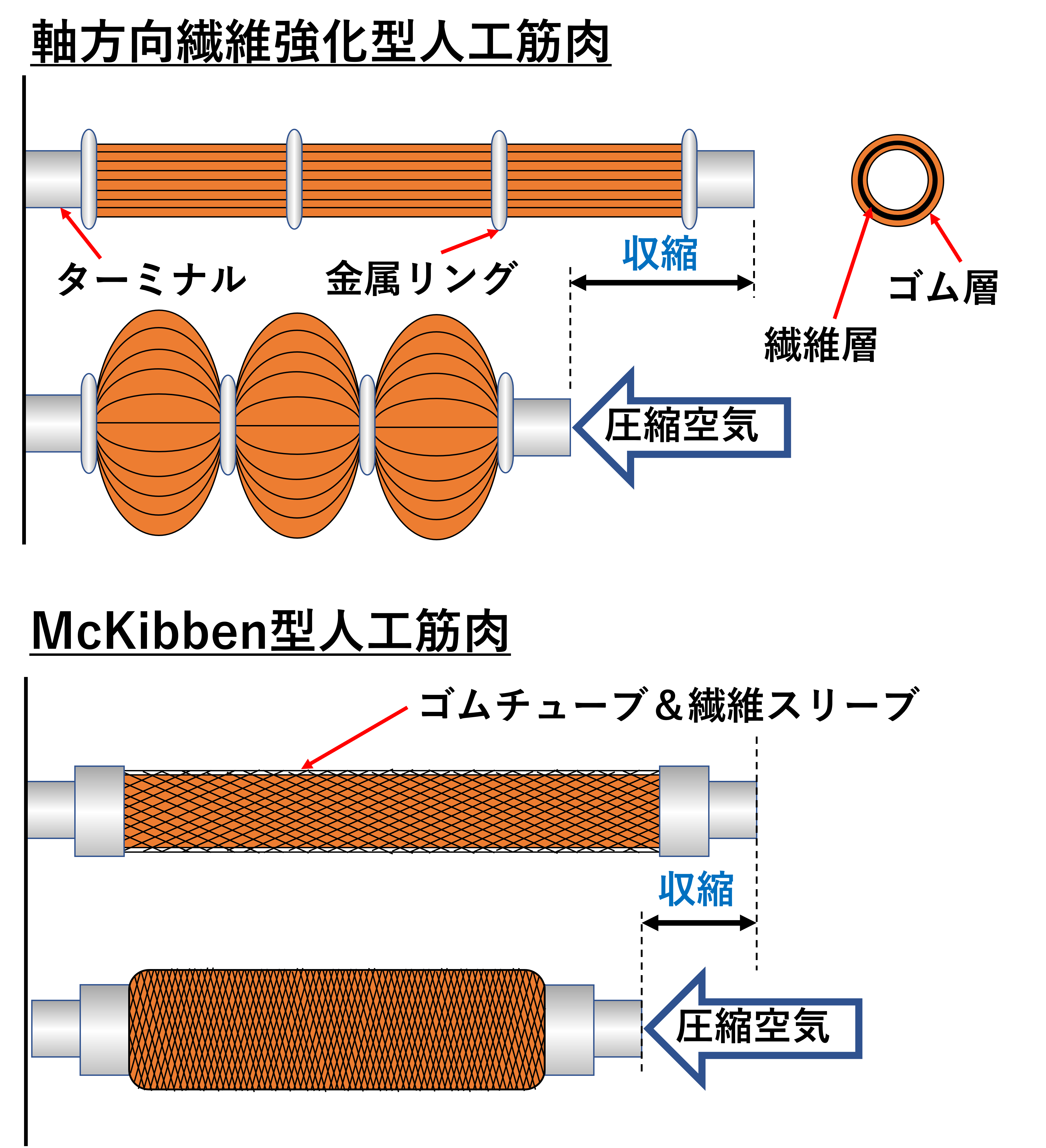 人工筋肉はロボットの筋肉とも言えるもので、本物の筋肉のように伸縮運動をおこないます。電気や熱、空気圧など色々な駆動方法がありますが、私たちの研究では空気圧で駆動するゴムチューブ形状の空気圧ゴム人工筋肉を扱っています。